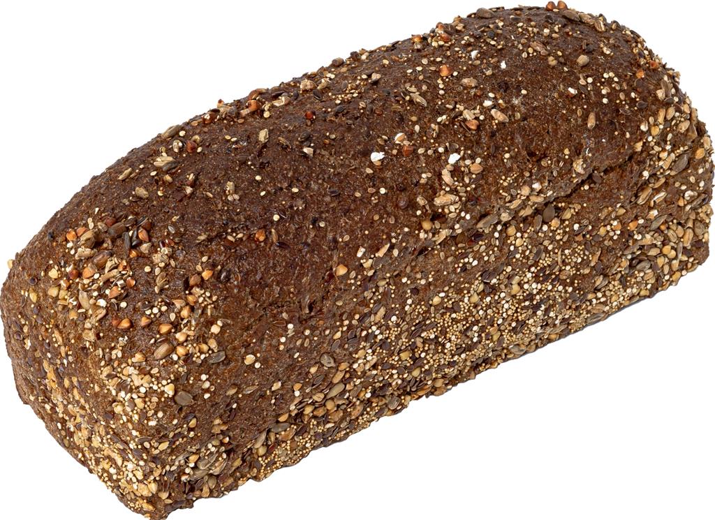 Een stoer brood, donker van kleur, niet volkoren maar bruin, bereid uit meerdere granen.